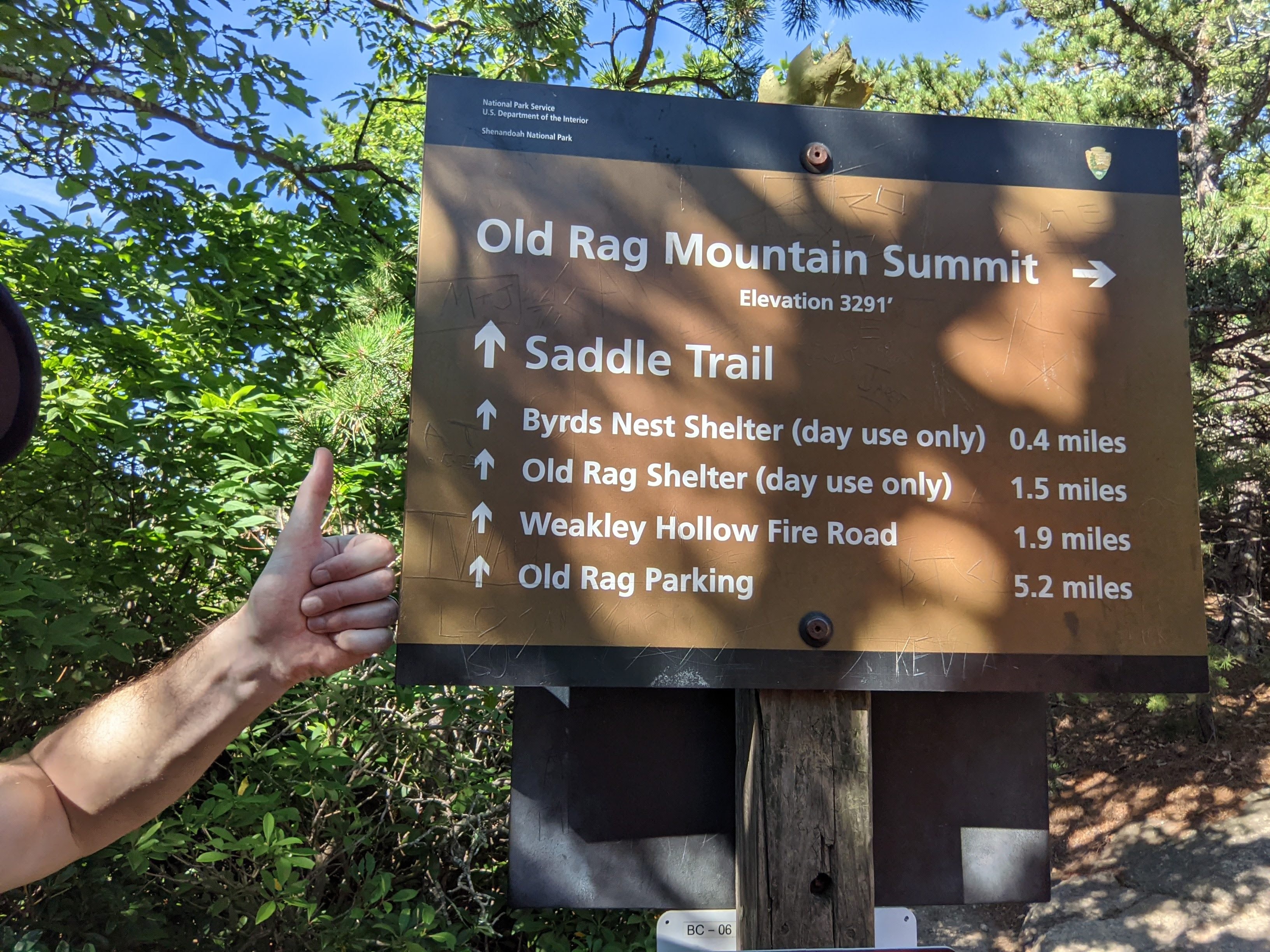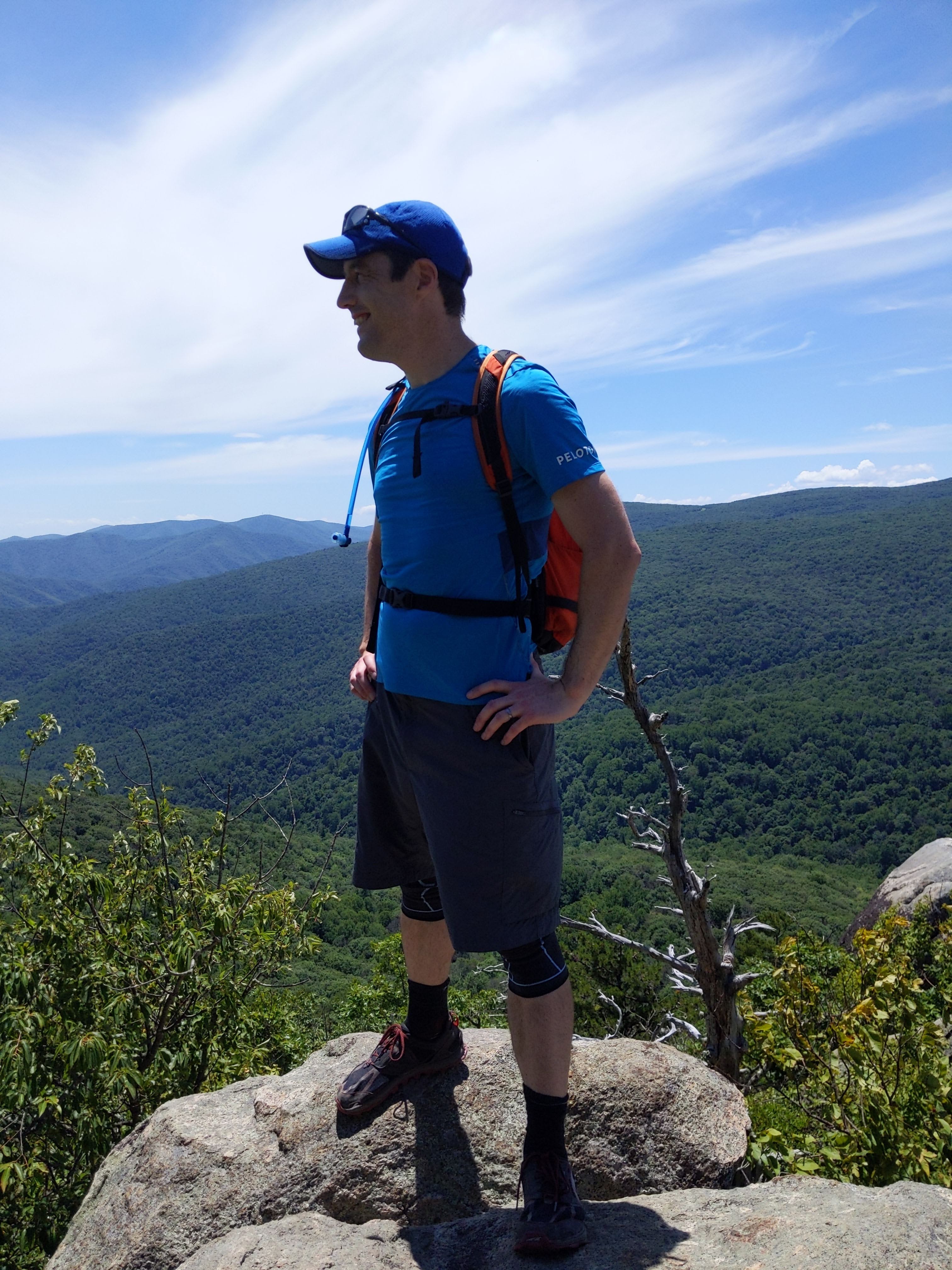 The summit is tiny and overgrown with trees and brush. A few big boulders and breaks still give tremendous views, including back towards Old Rag where we’d come from that morning.