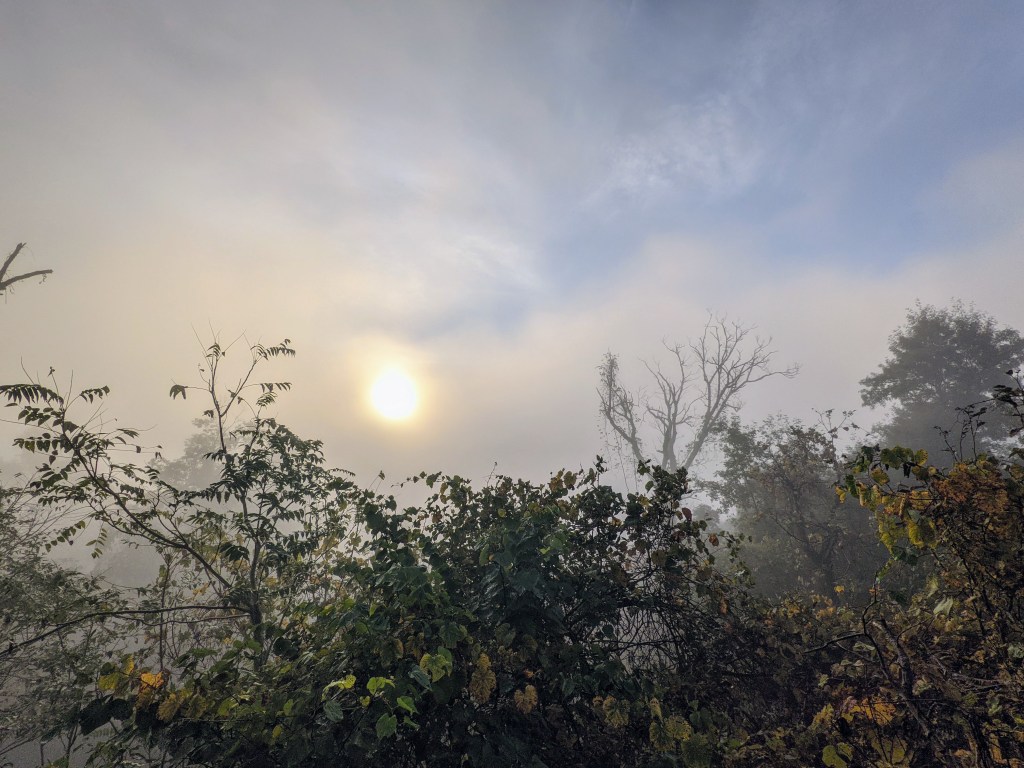 As I progressed along the ridge, the sun made an appearance, slowly burning off the mist and appearing out the cloud.