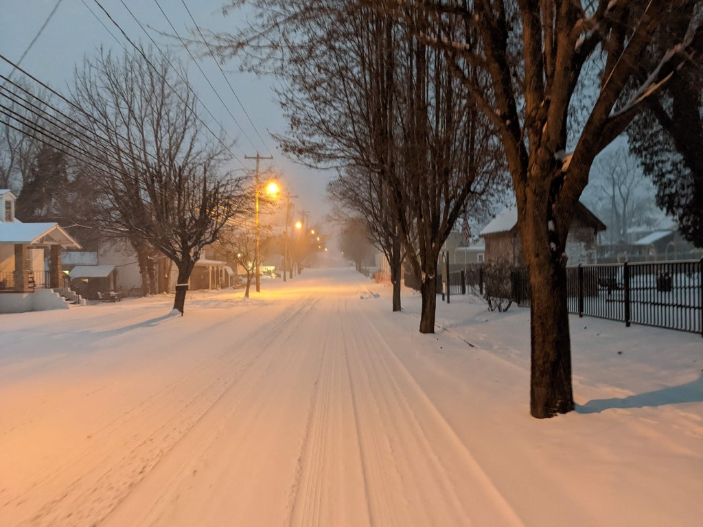 I extended my usual walk by tagging the park boundary sign. It snowed during the walk, which is always a fun experience. As I walked home through town, I saw a car that had slid off the road into the fence and narrowly avoided dropping further down into the stream bed. Yikes!