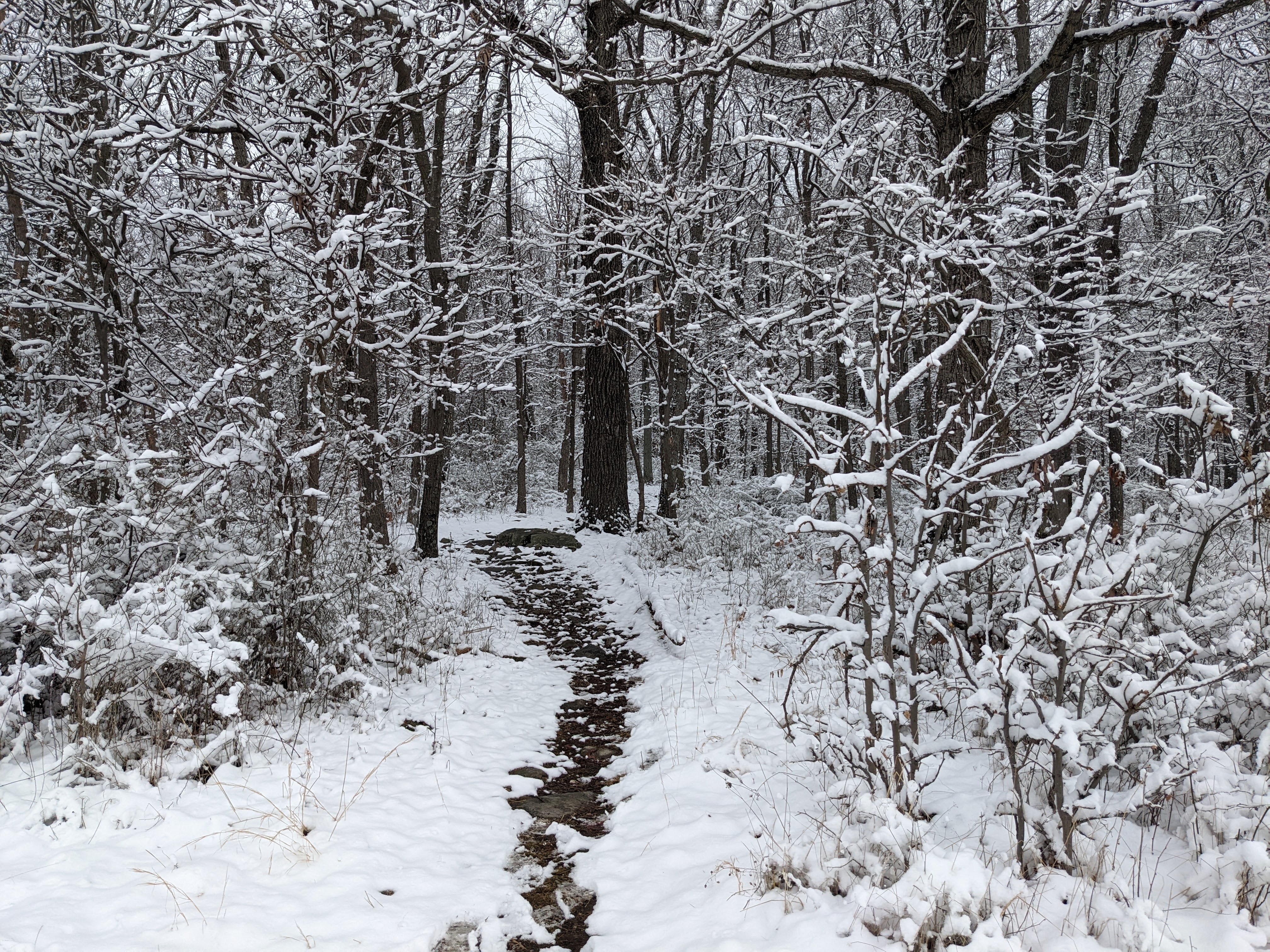 The most scenic walk of this season. A surprise late season snowstorm dumped a few inches of heavy snow on Saturday. A cold night ensured it was still all there the next day. It coated everything. Stunning!