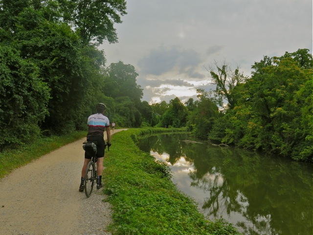 The following morning, I biked for 22 relaxing miles along the bike trail to our rendezvous at the boat ramp. My paddle board was rolled up and strapped to the top of my front pannier rack. Apart from slightly heavier steering, the effect on my bike handling was minimal.