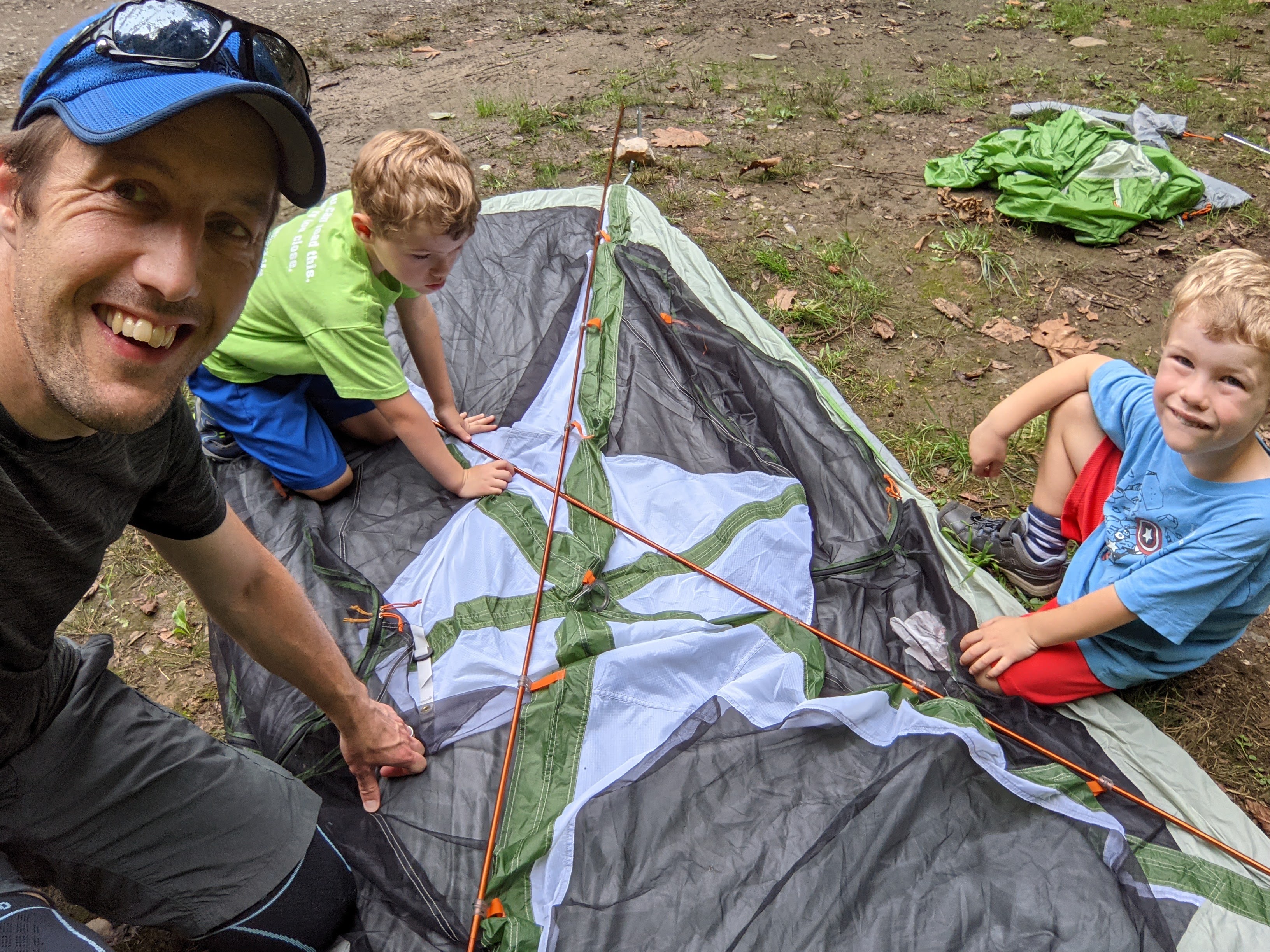 We arrived at the campsite around 5 pm. I couldn’t find the caretaker, so we picked the furthest tent site and set up camp. The boys helped put the tent up, and then proceeded to trip over the tent pegs every 5 minutes 😉