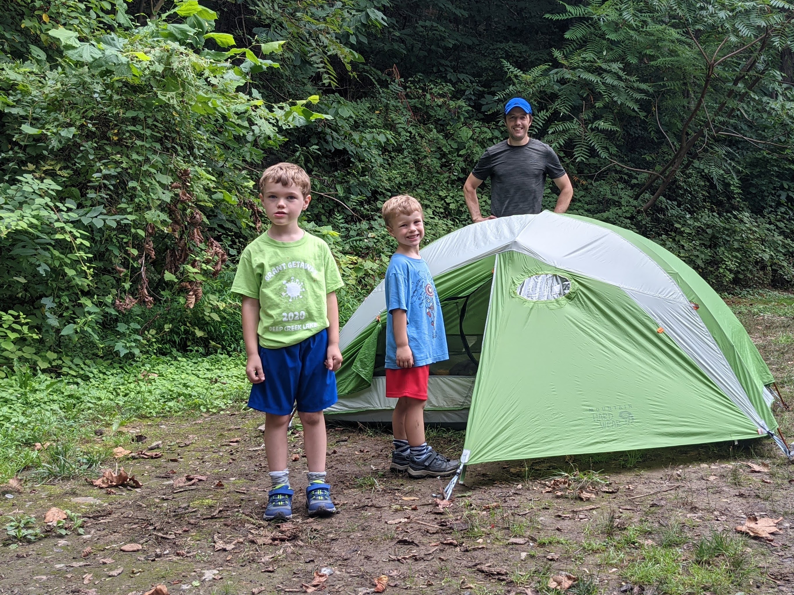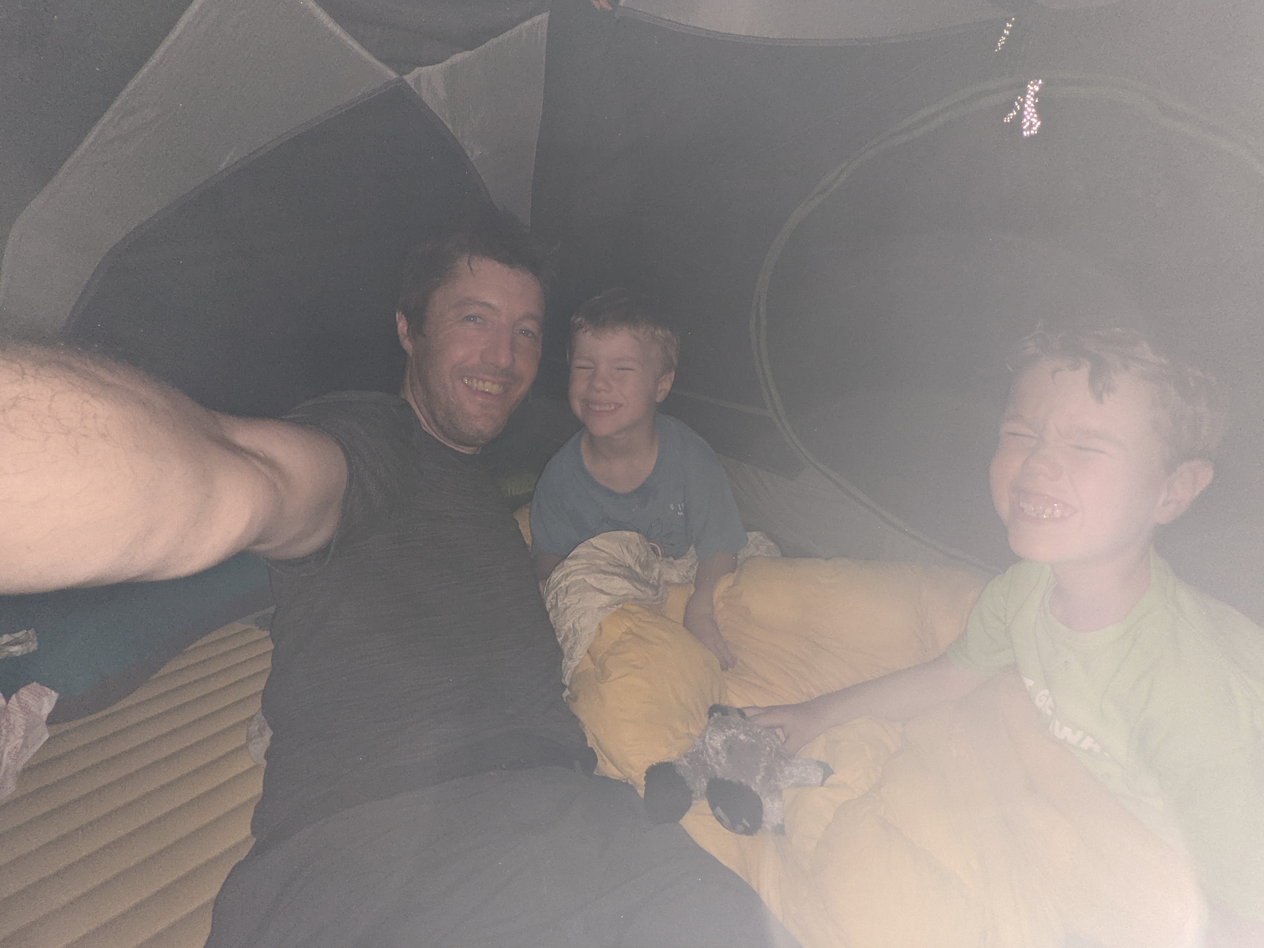 The tent is a 7 year old Mountain Hardwear Skyledge, which is a lightweight 2-person tent. It was comfortable with me and the boys, if a little cozy. I’ll consider taking the 3-person pyramid tent next time.