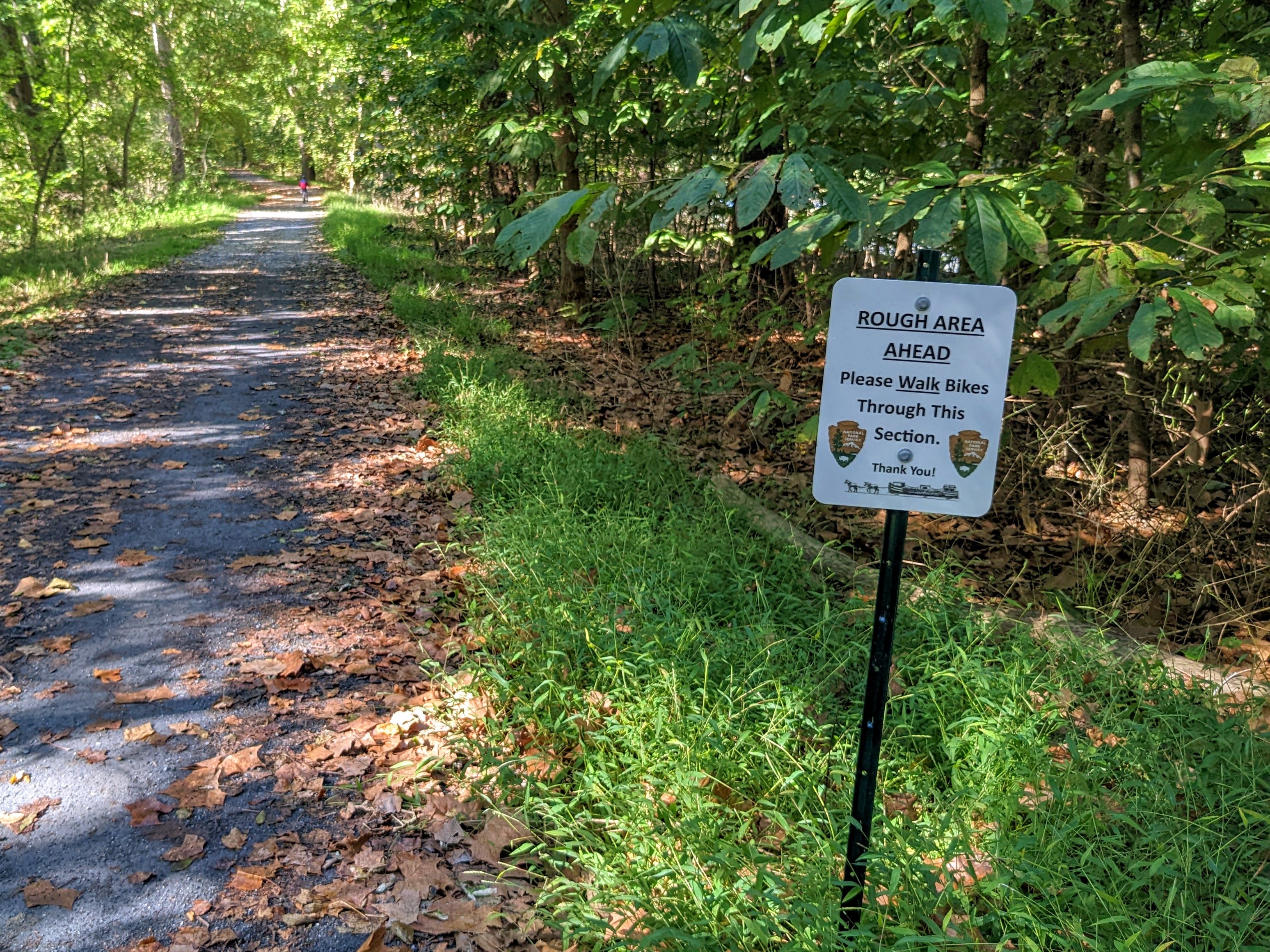 In some ways, it’s an even better route because there are fewer people and less bike traffic. It’s completely in the woods so the scenery is lovely. The surface is good quality crushed gravel with only a few rough patches.