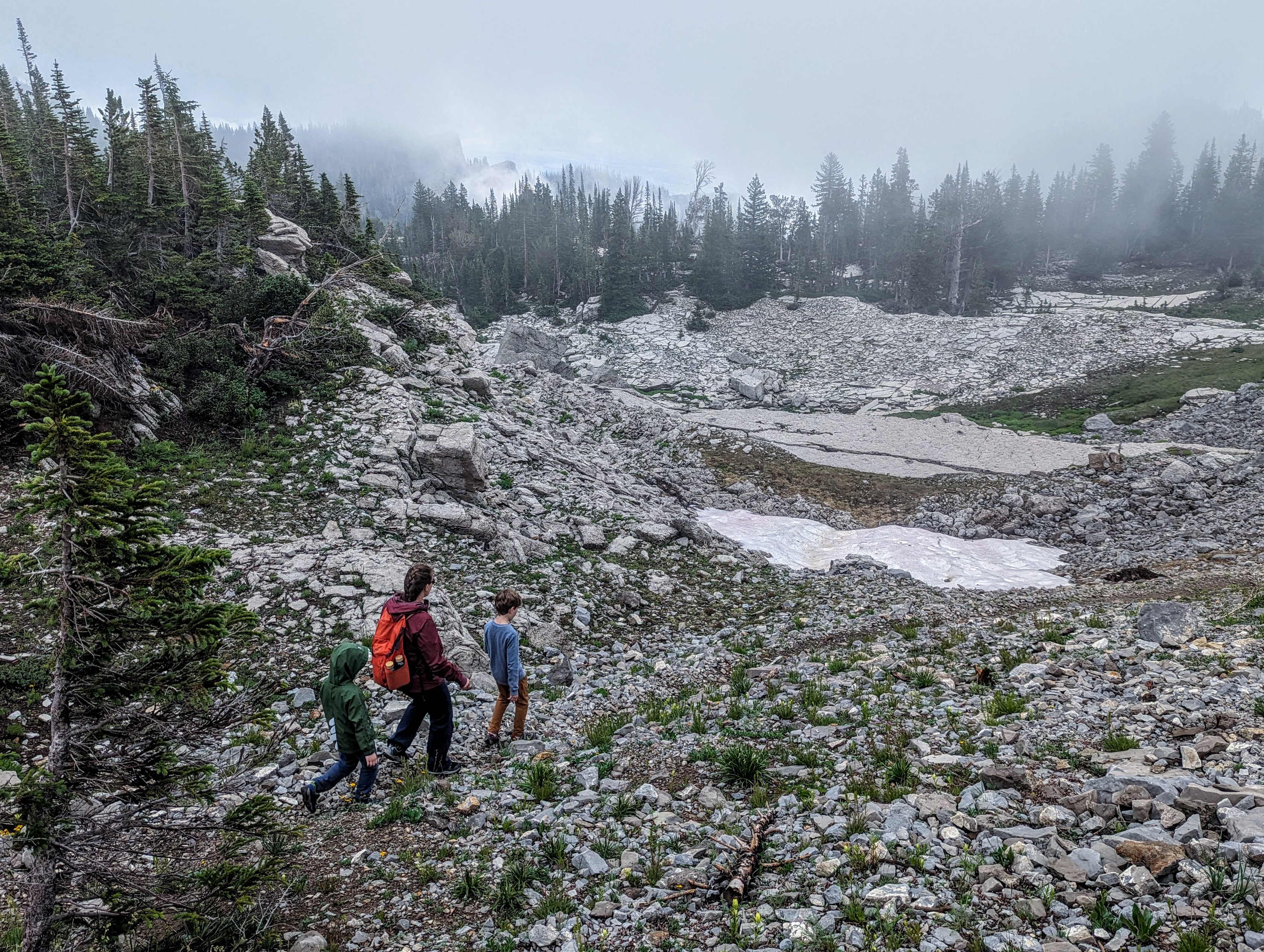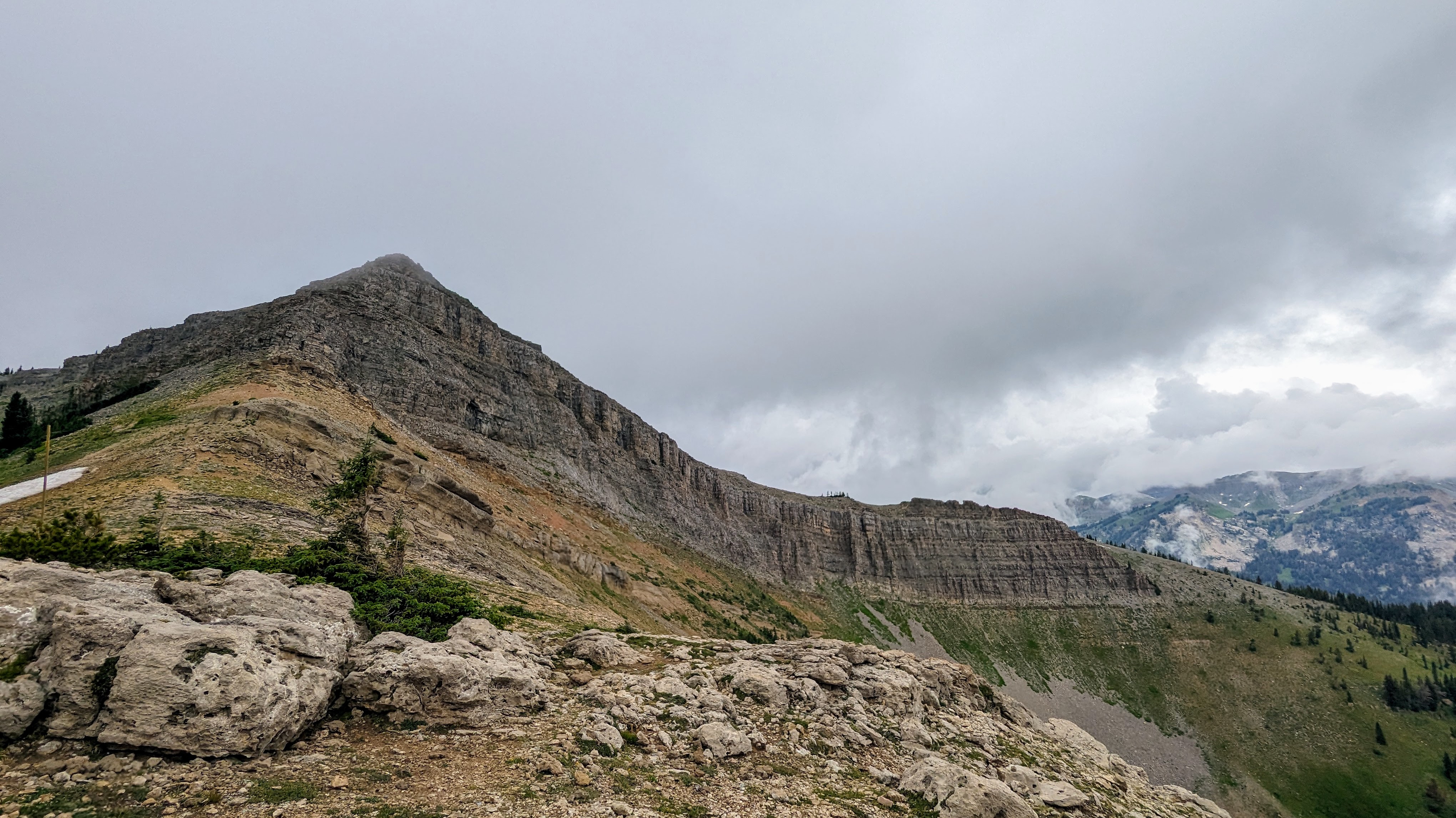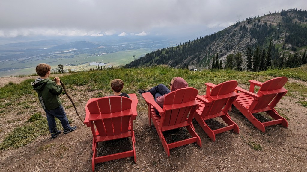 Down in the valley, it was fully overcast and grey. As we ascended we went into, then back out of the clouds. The views were spectacular from the top, even if most of the Teton range was still hidden by clouds.