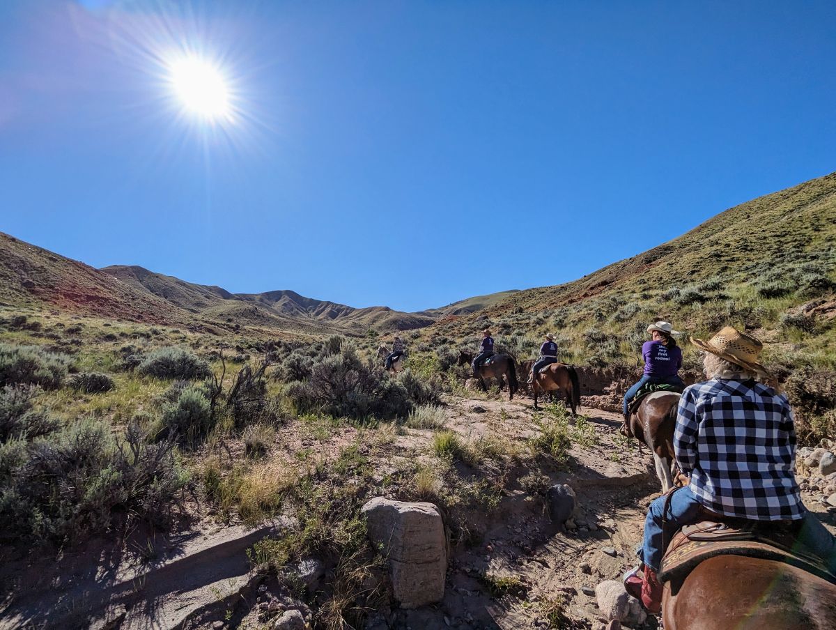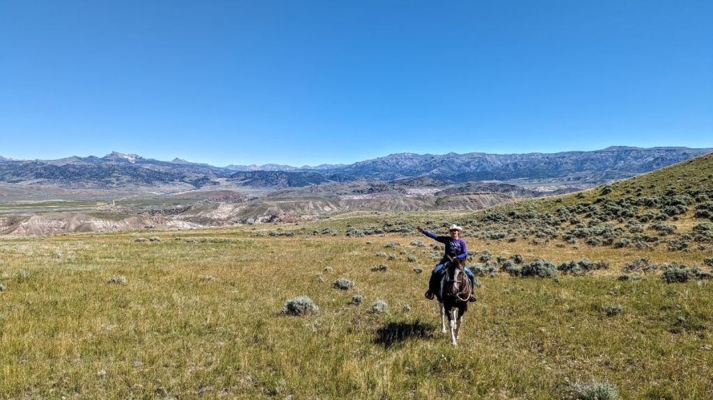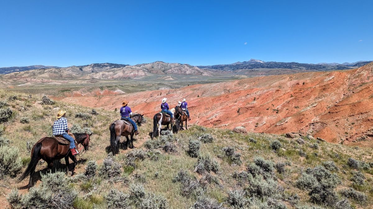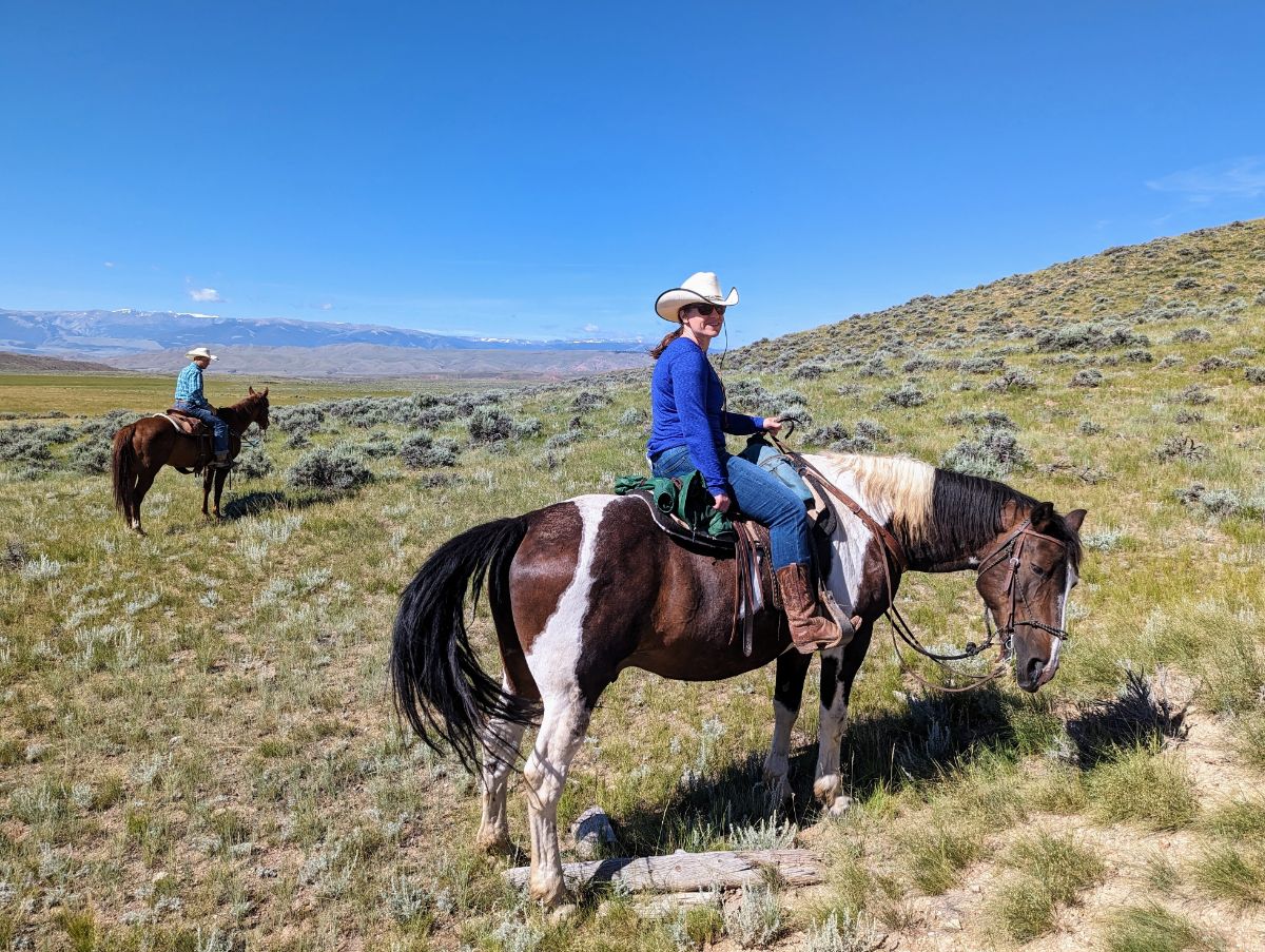Riding up the lower gulch towards the plateau in the distanceRiding through the canyon as the walls closed inEmerging from the top of the gulch. You get a good view from the top of a horse!Rich on the high plateauLexi on the high plateauAnother guest looking at the Wind River mountain range in the distanceWide open countrySteep descent, hold on tight and lean back!Descending into the red canyon near the ranchThanks for a great week, Misty!
