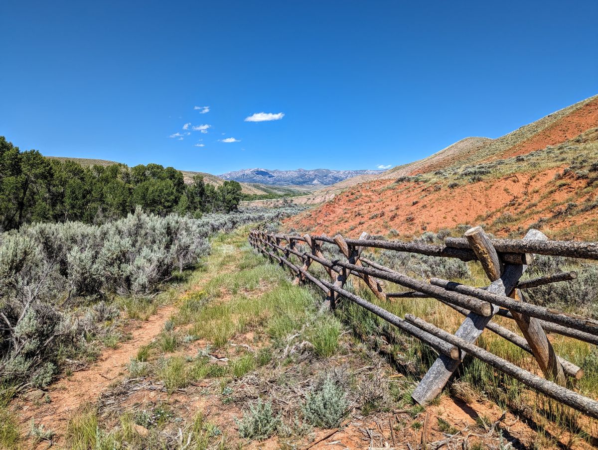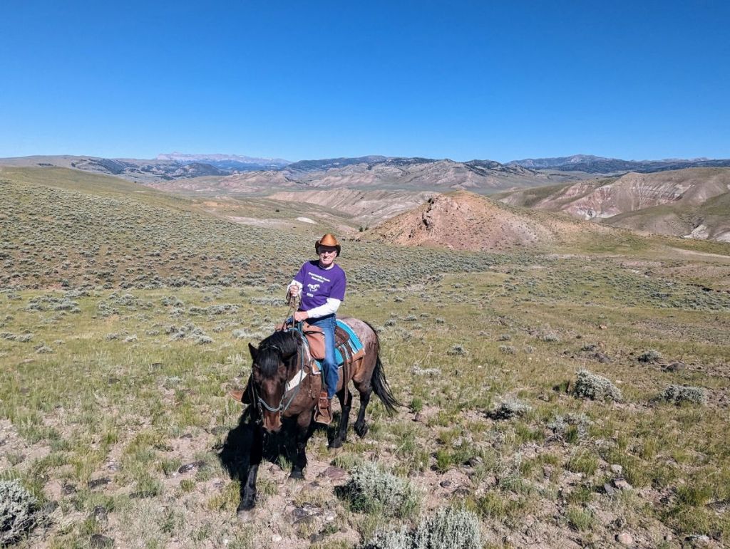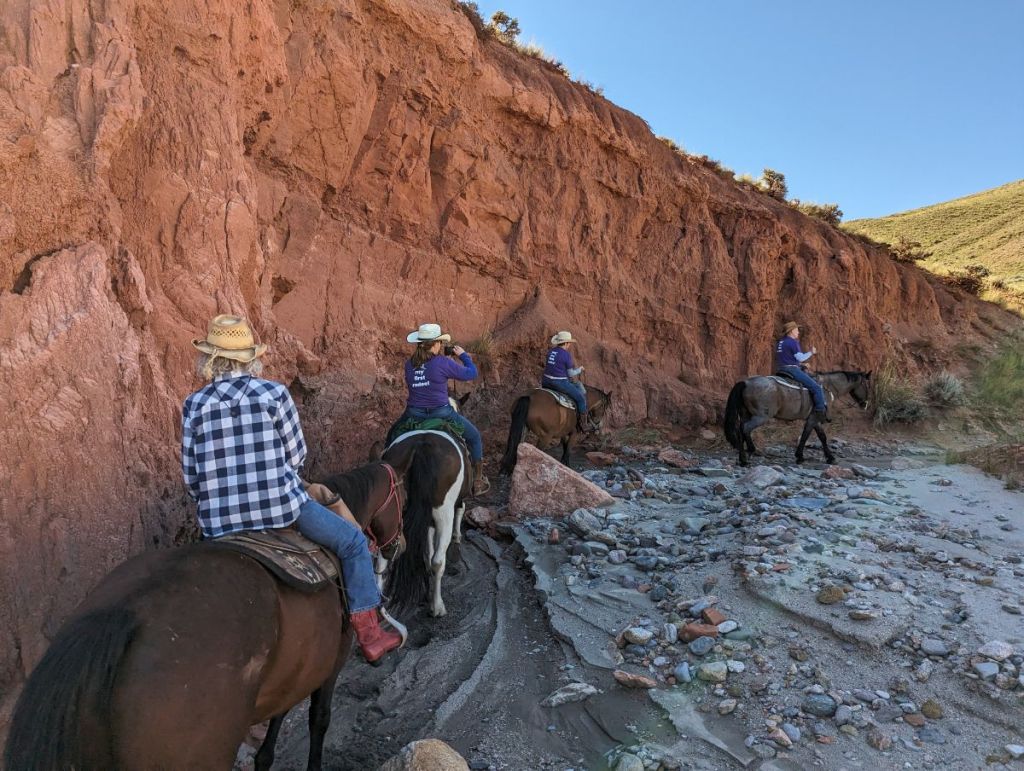 Riding up the lower gulch towards the plateau in the distanceRiding through the canyon as the walls closed inEmerging from the top of the gulch. You get a good view from the top of a horse!Rich on the high plateauLexi on the high plateauAnother guest looking at the Wind River mountain range in the distanceWide open countrySteep descent, hold on tight and lean back!Descending into the red canyon near the ranchThanks for a great week, Misty!