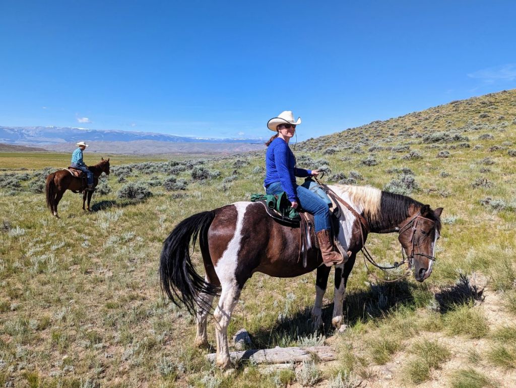 Lexi riding with the Wind River mountain range on the horizonButch Cassidy’s hideout? Not quite… this is an old store room, sunk into the earth to keep it coolWrangler Ethan (our guide that day) and Lexi taking a break