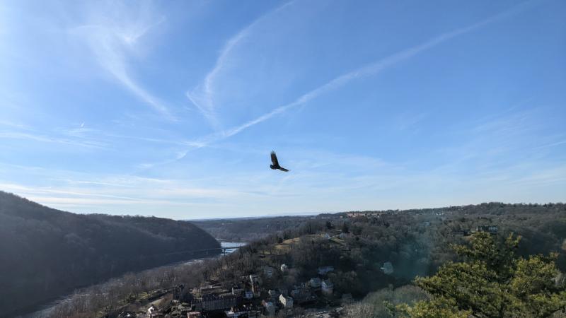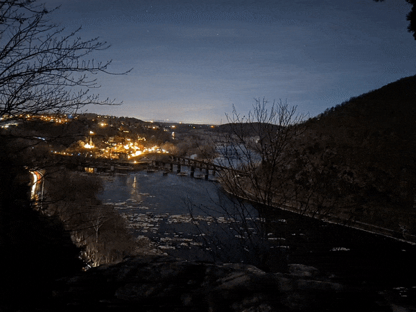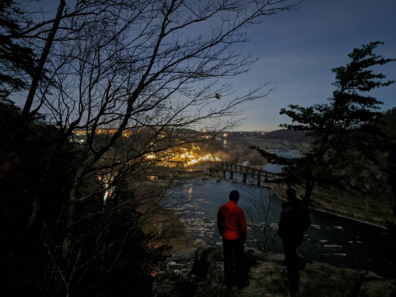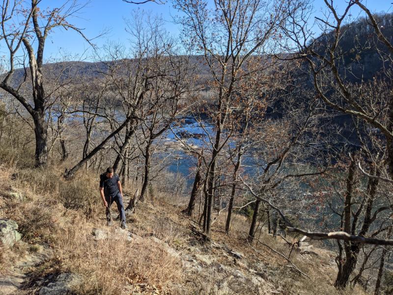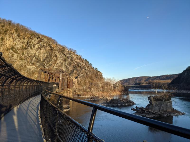 Pete climbing up Maryland HeightsMe, just below the main lookout of Maryland Heights, looking over Harpers FerryLooking NW upstream of the Potomac RiverMe traversing the blocks to reach the main lookoutTurkey vulture flying on the thermalsBrothers at Maryland Heights lookoutBrothers on the summit of the Stone Fort loop, with the Potomac River visible in the backgroundMe descending Maryland Heights in the waning lightTwo shadows walking along the C&O canal back into townThe ruined lockhouse at Harpers Ferry (Maryland side of the river)Another view of the ruined lockhouse with the cliffs of Maryland Heights aboveCrossing back into West Virginia, with the moon outBeautiful evening light as we walked back through town