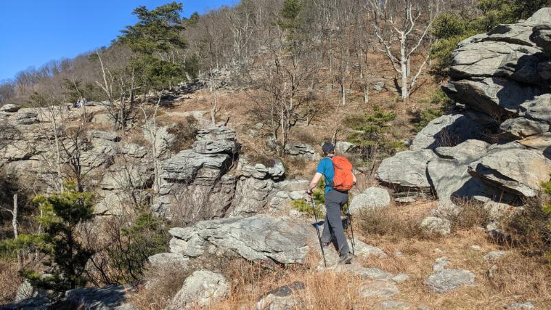 Counter-intuitively, the flat, hard-packed surface of the canal was harder on my feet than climbing the mountains, so I was happy to reach the turn north on the A.T. to head up Weverton Cliffs. I’ve climbed it several times before (from home and with family) so I knew what was in store.
