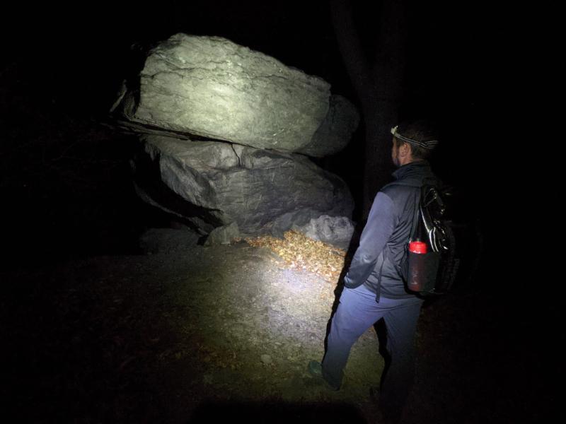 Leaving town to head up Loudoun Heights, peak 3Photo of a photo at sunsetWe switched on the head torches when we crossed Chestnut Hill RoadPete at the boulder, very close to Loudoun Heights lookoutMe (red jacket) and Pete (black jacket) at Loudoun Heights lookout at night