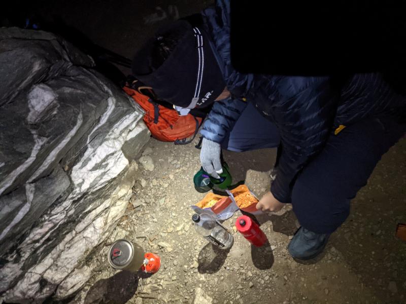 Pete cooking on the summit of Loudoun HeightsMountain dining: spaghetti bolognese!Head torches mandatory