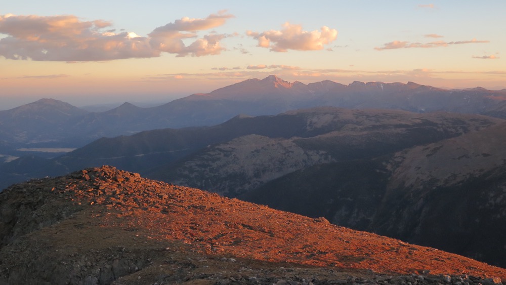 Sunset on the descent over Mount Chiquita, after summiting Mount Ypsilon