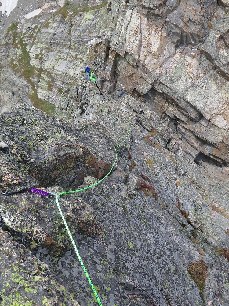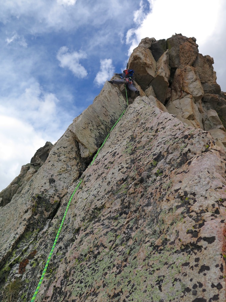 Steve led each pitch since I long ago relinquished any claim over the sharp end of the rope. The route led up steep faces and corners, across knife-edge crests with several abseils to drop off the back side of the ridge’s jagged teeth. In all, it was 8 varied pitches of exposed climbing up to 5.6 grade.